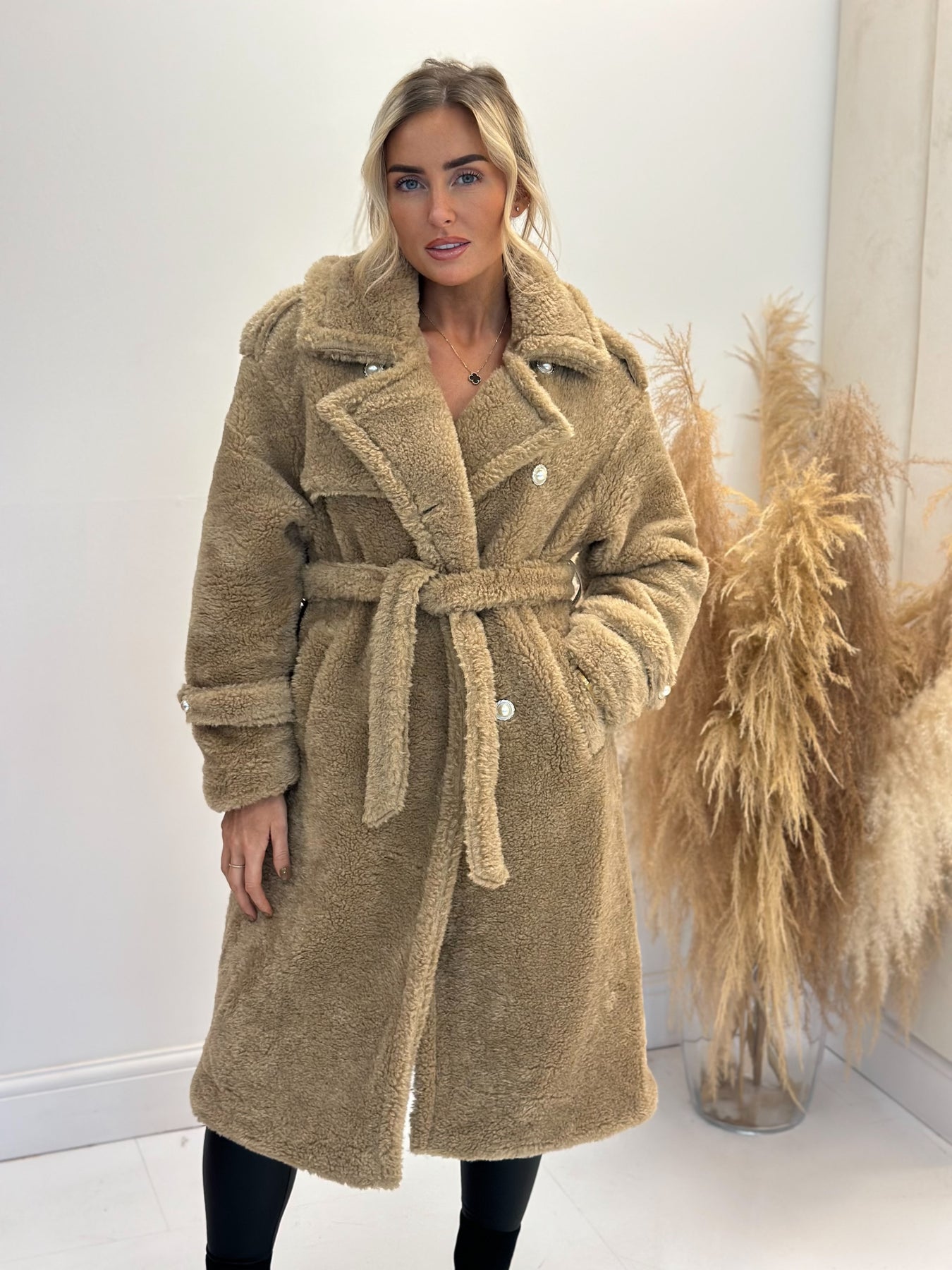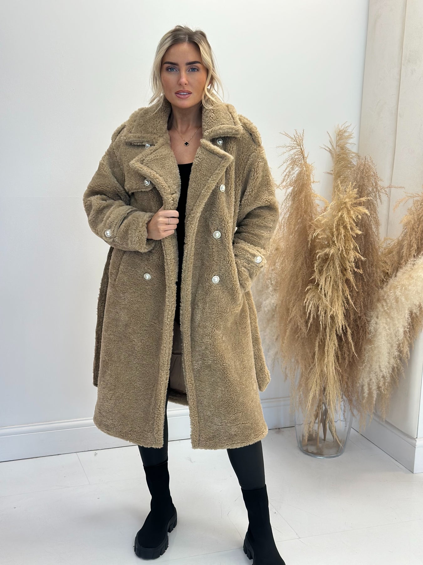Justina beige pearl button teddy coat