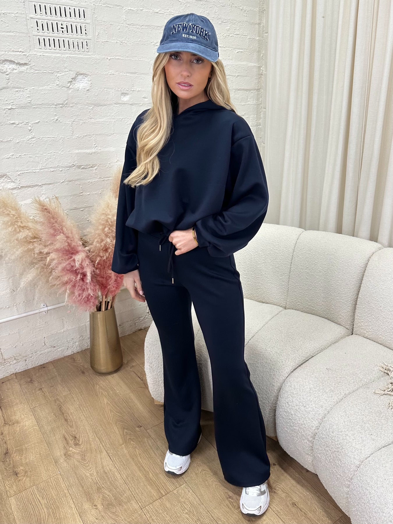 Harriet navy hoody top & flared drawstring waist Trouser Set