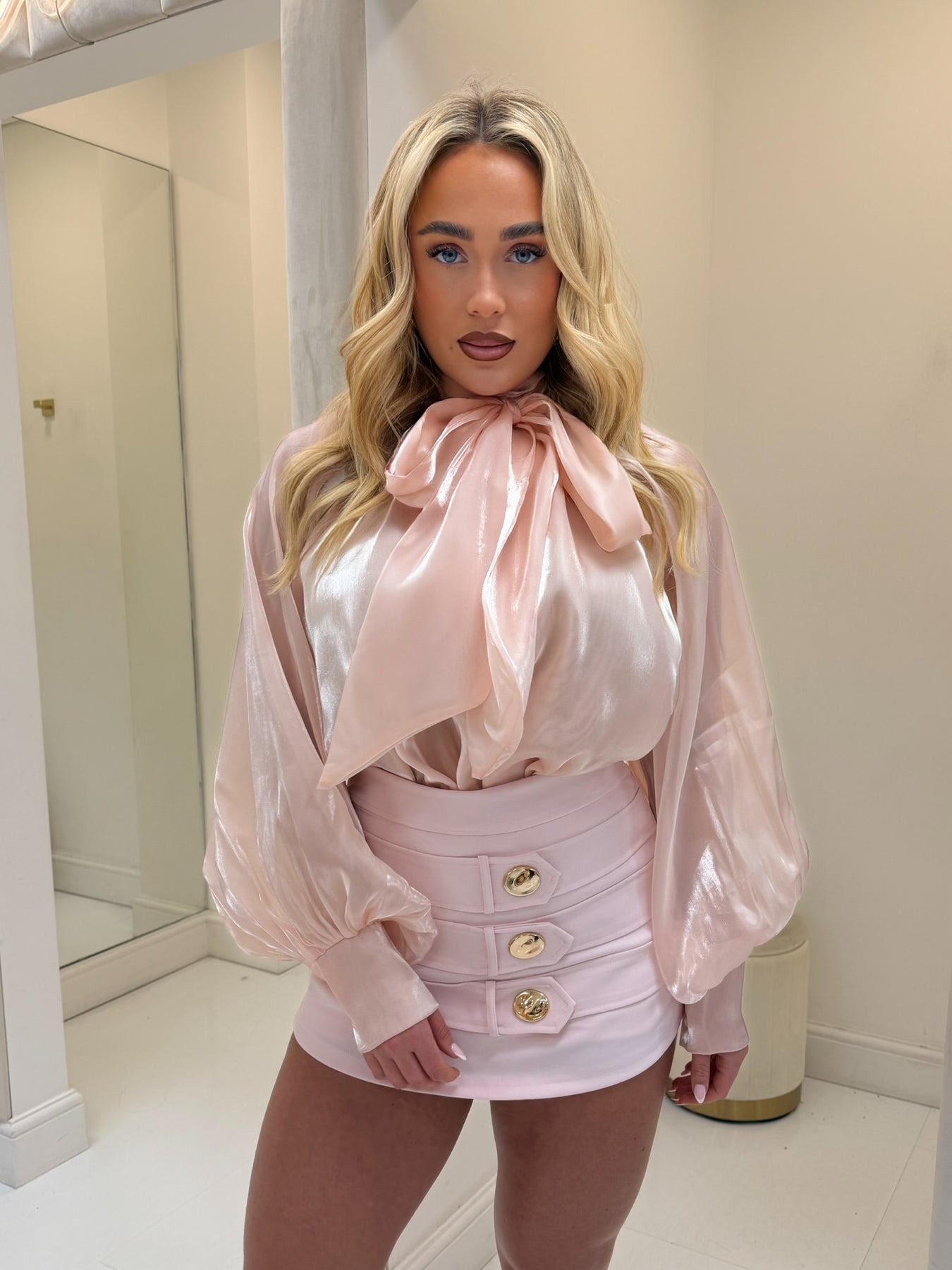 MELODY PINK PUSSY BOW SHIMMER BLOUSE