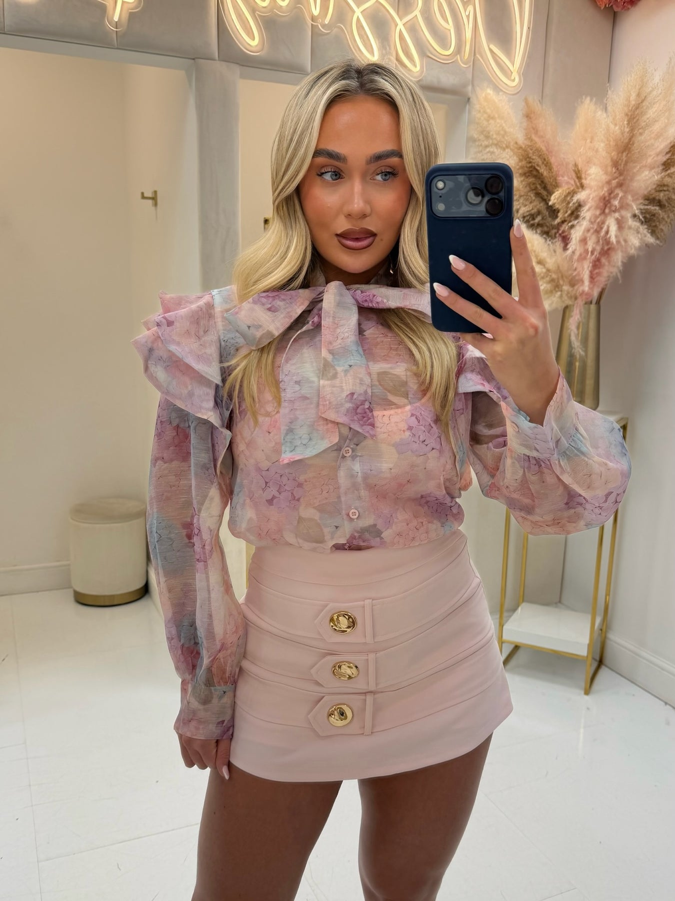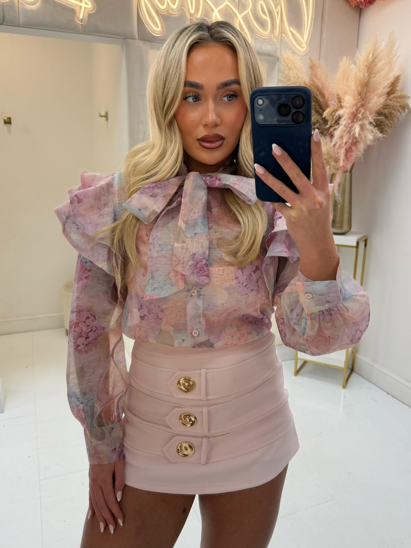 TEAGAN PINK FLORAL PUSSY BOW SHIRT