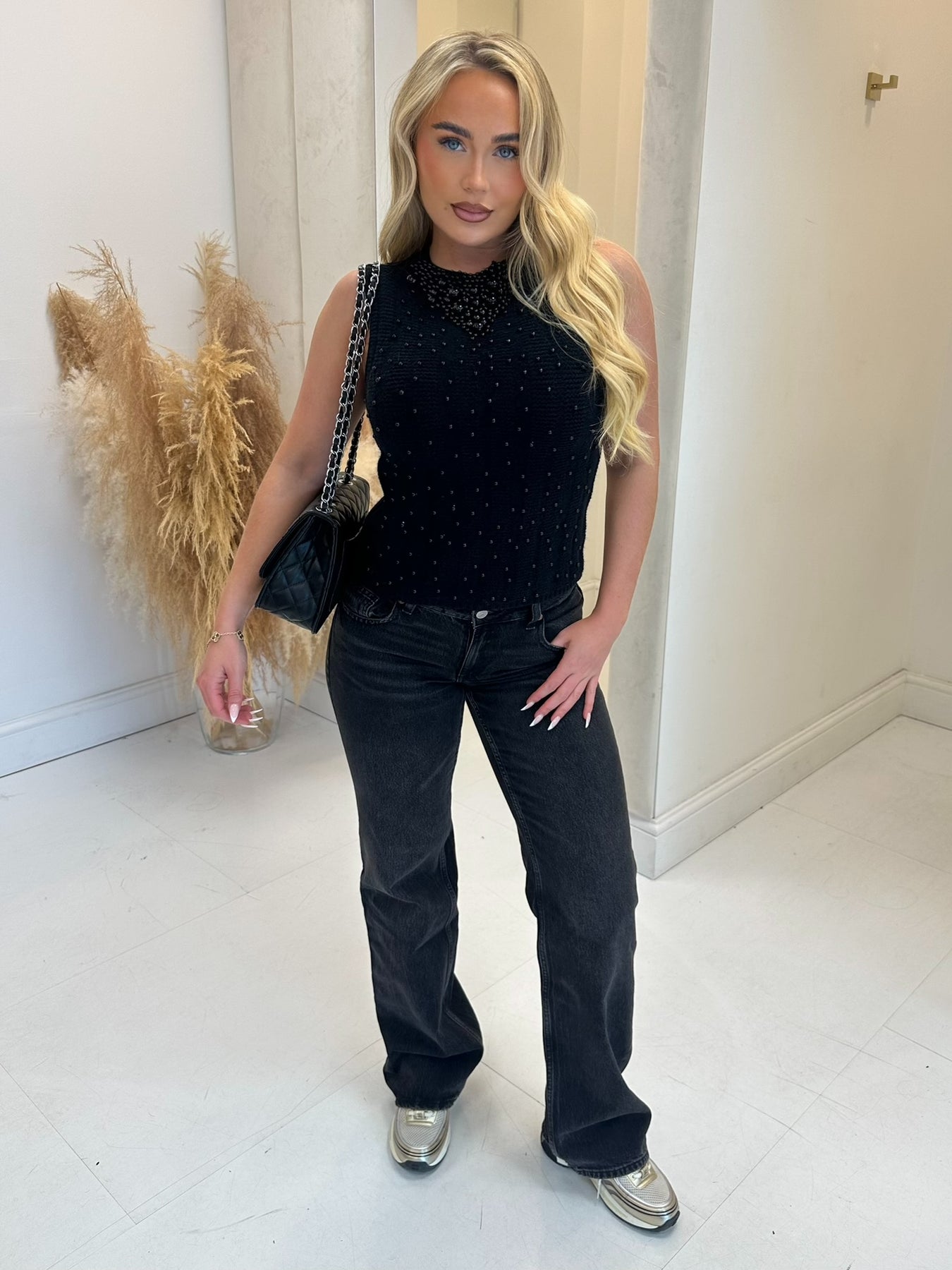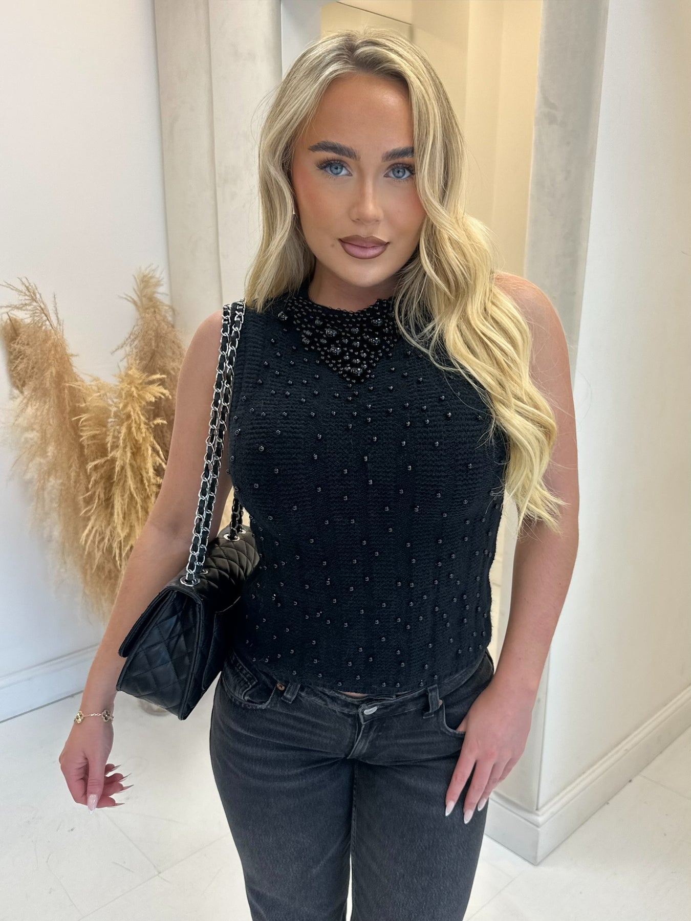 Amanda black pearl detailed sleeveless jumper