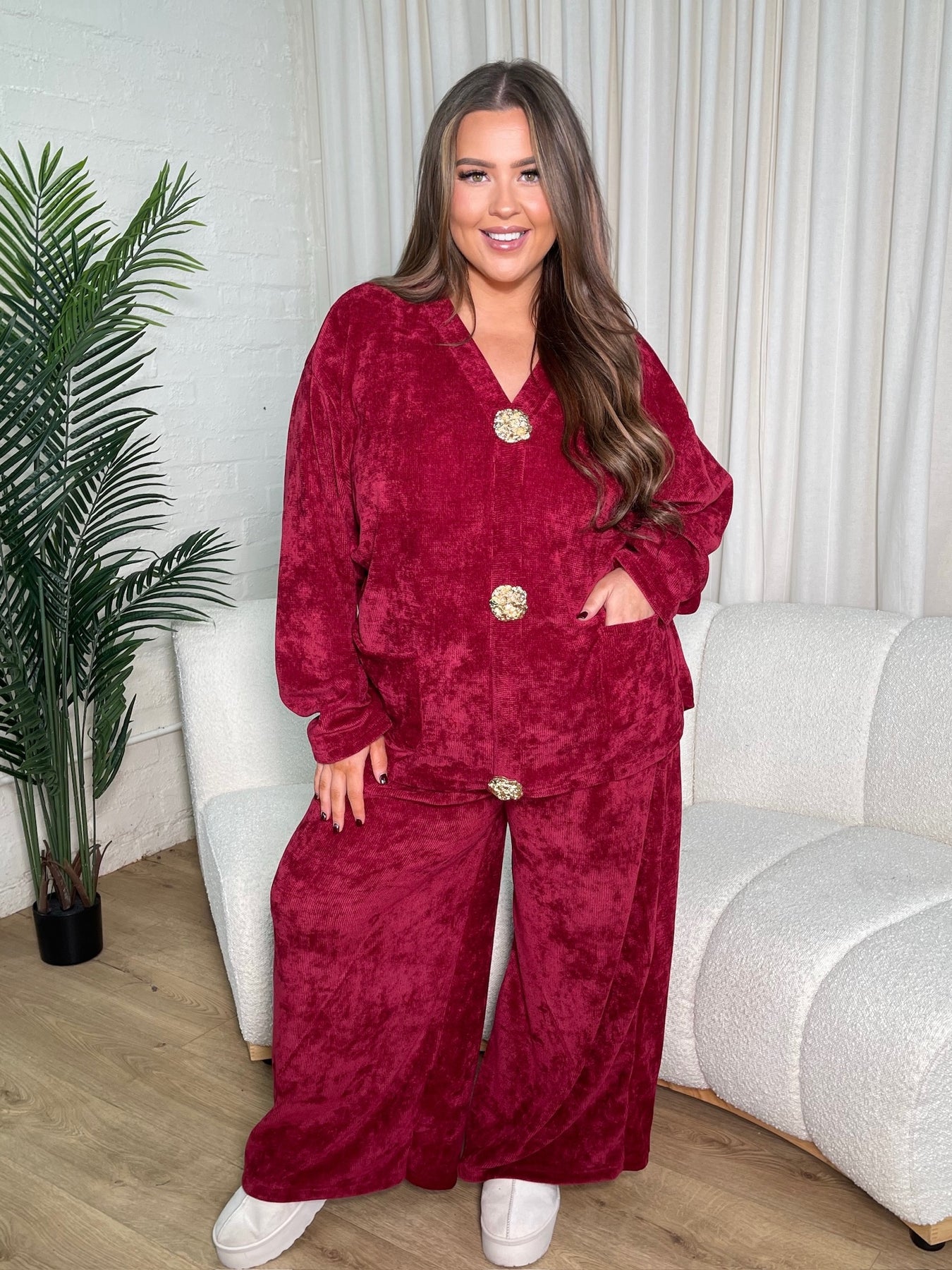 Carson Curve Red Velour Waffle Gold Button Co-Ord